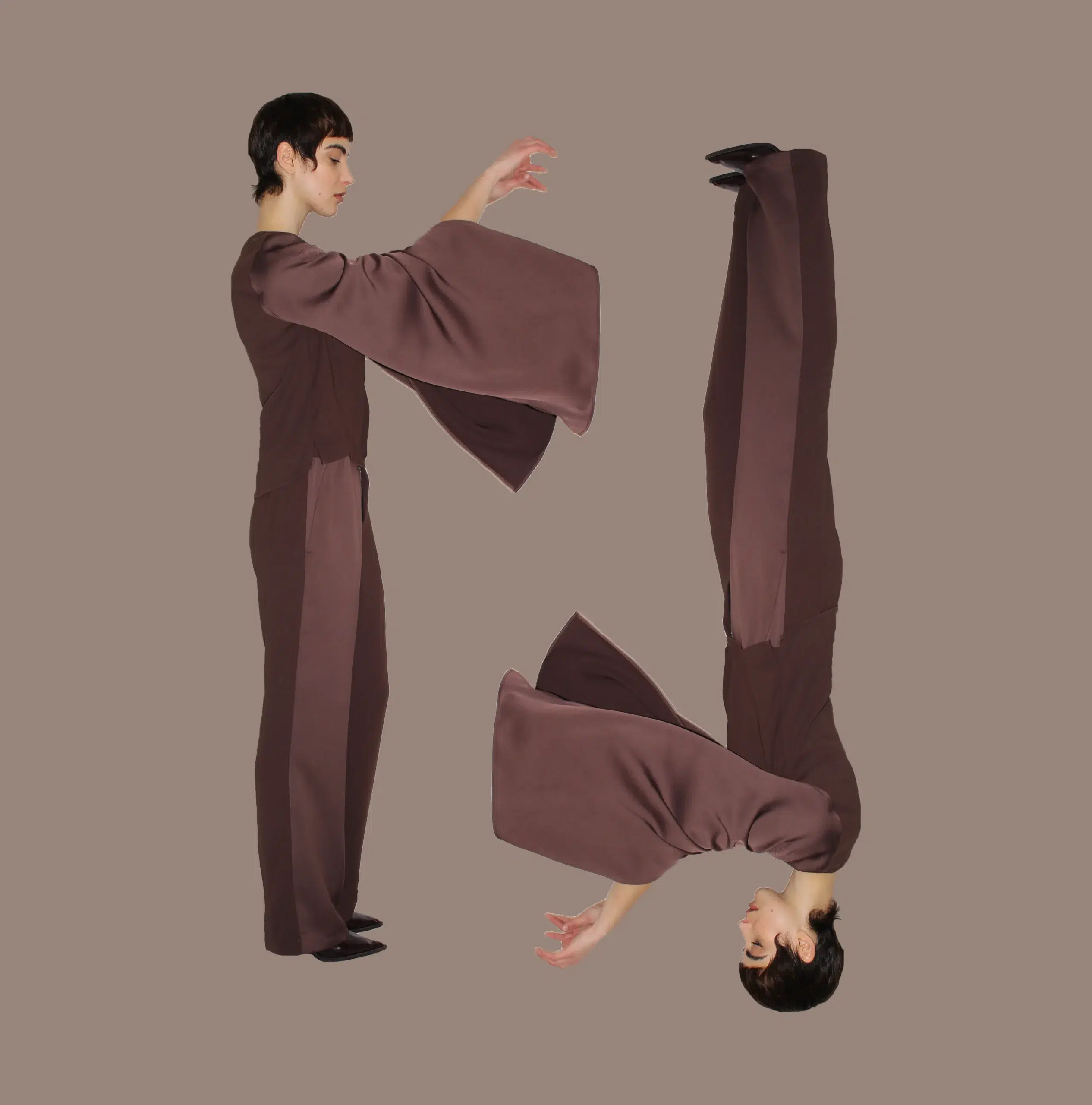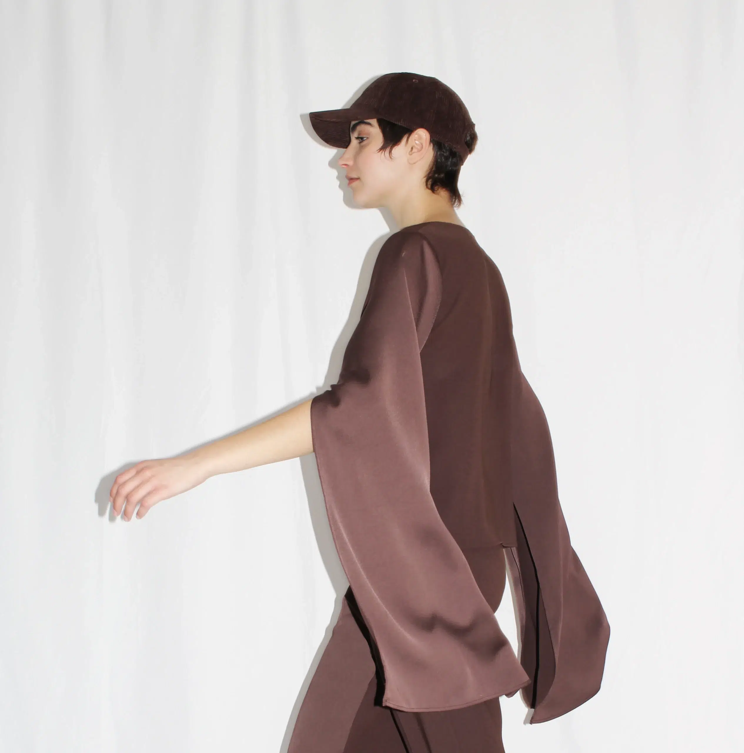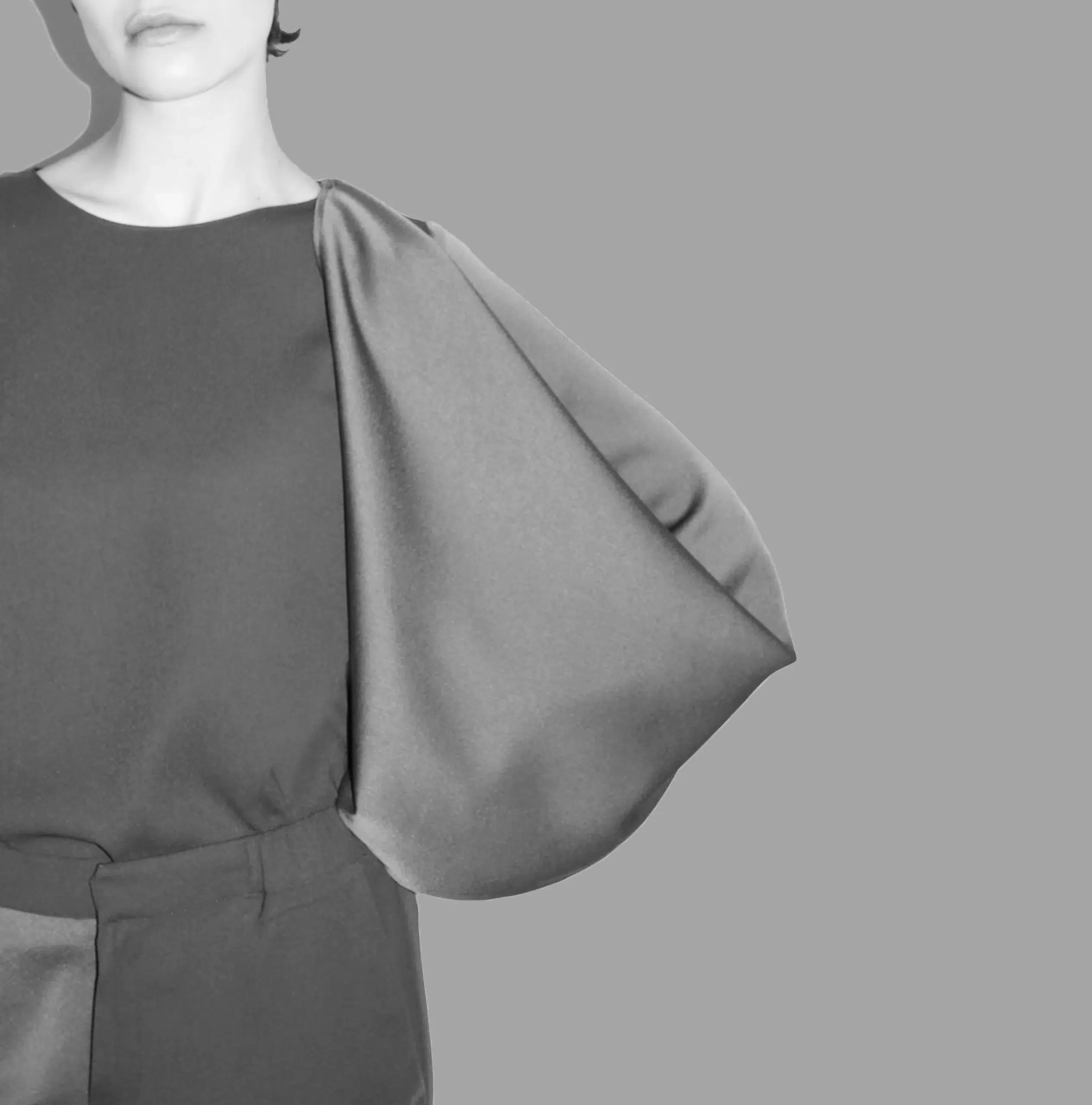 The Il Momento Blouse is a versatile and expressive piece designed to transform with the wearer. Long satin sleeves add fluid movement and elegance, while an internal fastening with a hidden button allows the sleeves to be adjusted and reshaped, creating a second silhouette for both functional and aesthetic purposes.