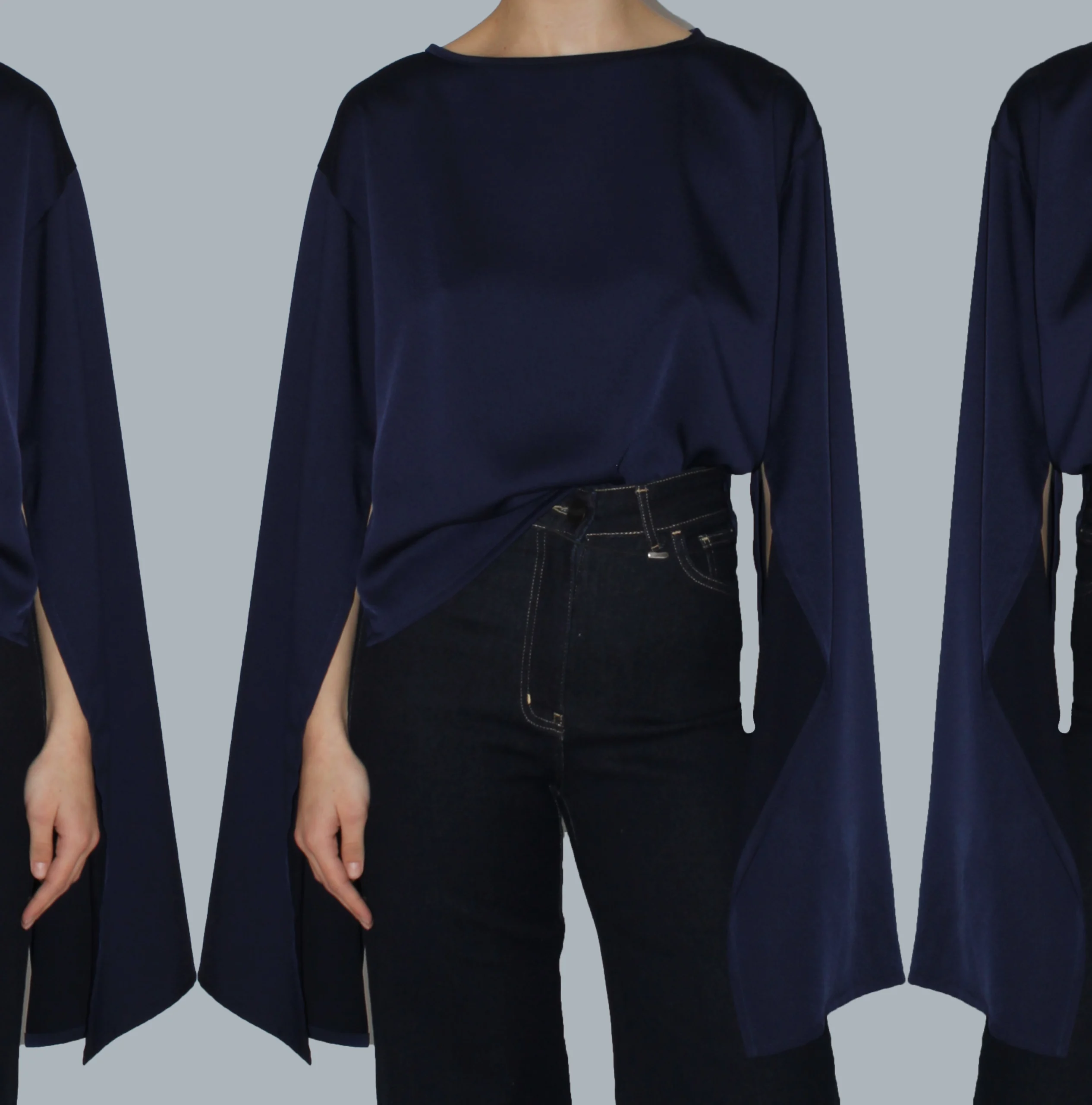 Long sleeves inspired by the Il Momento aesthetic add softness and natural movement to the garment, enhancing its expressive yet minimal character. The design focuses on fabric, form, and flow, allowing the blouse to stand out through simplicity and proportion.