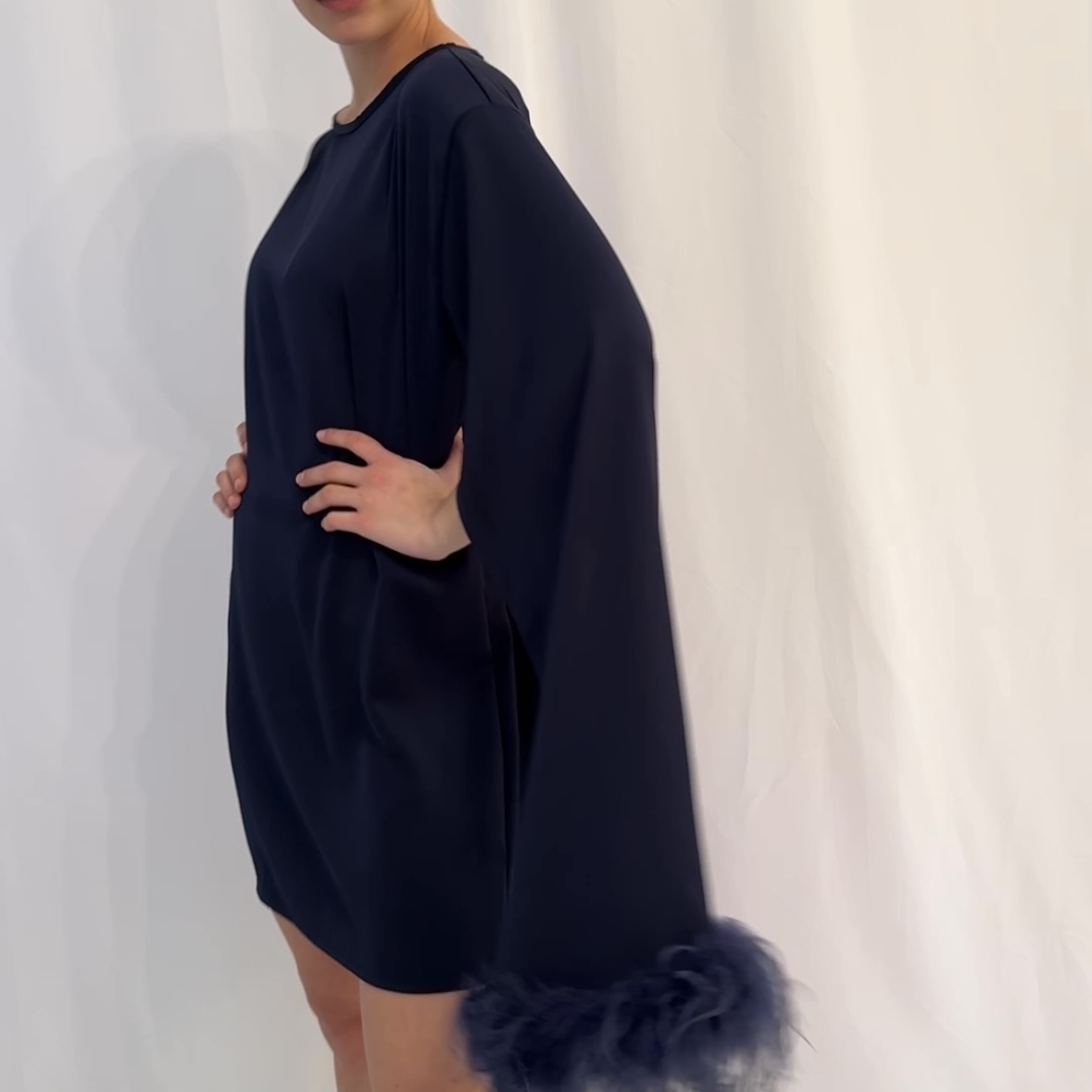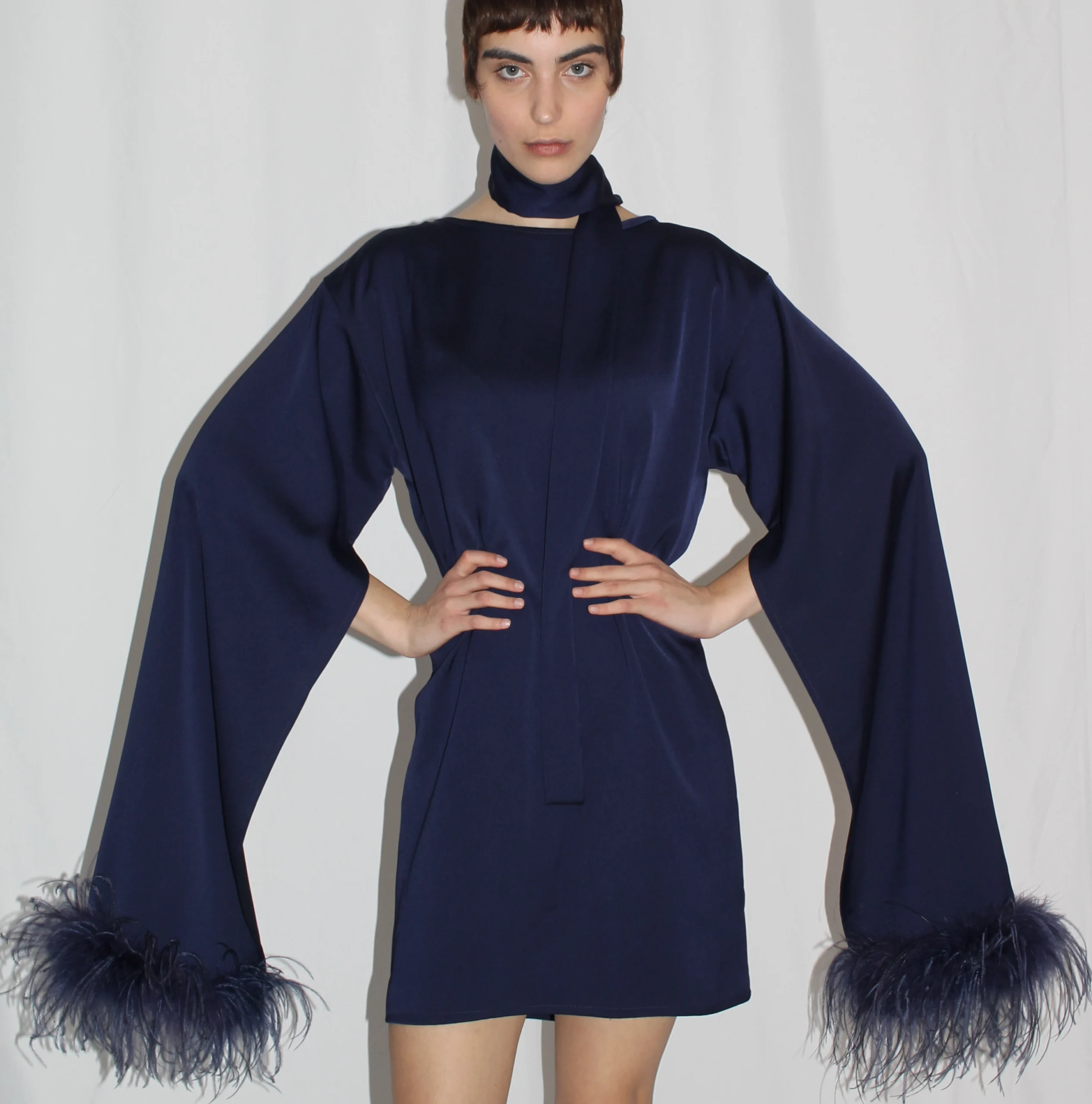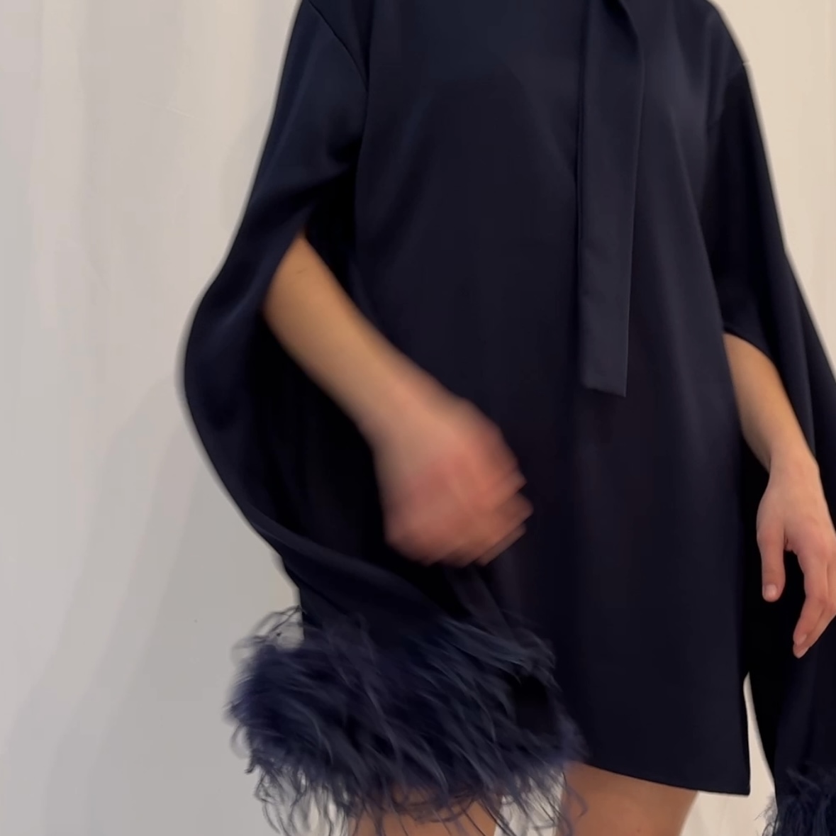 Long sleeves inspired by the Il Momento blouse add fluid movement to the design, enhancing the sense of motion with every step. Hand sewn ostrich feathers embellish the sleeves, bringing texture and character to the garment. The dress includes a matching fabric belt that allows you to adjust the shape and length, transforming the fit according to your style and mood.