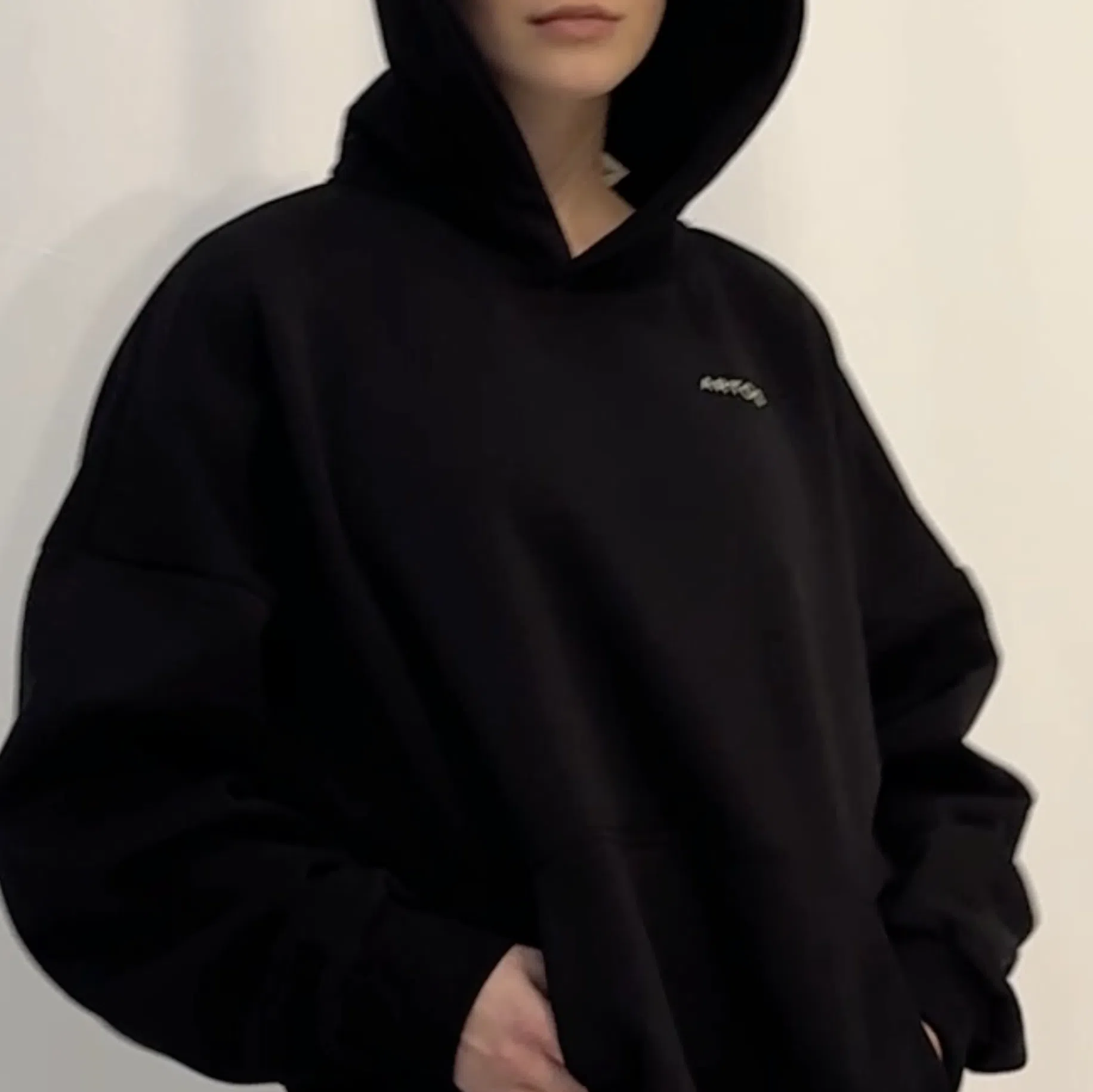 Designed with a unisex, oversized fit, this hoodie offers comfort and a relaxed silhouette while maintaining a strong visual identity. The black base color is enhanced with silkprint stamp details, applied using a silkprint printing technique for a clean and long lasting finish.
