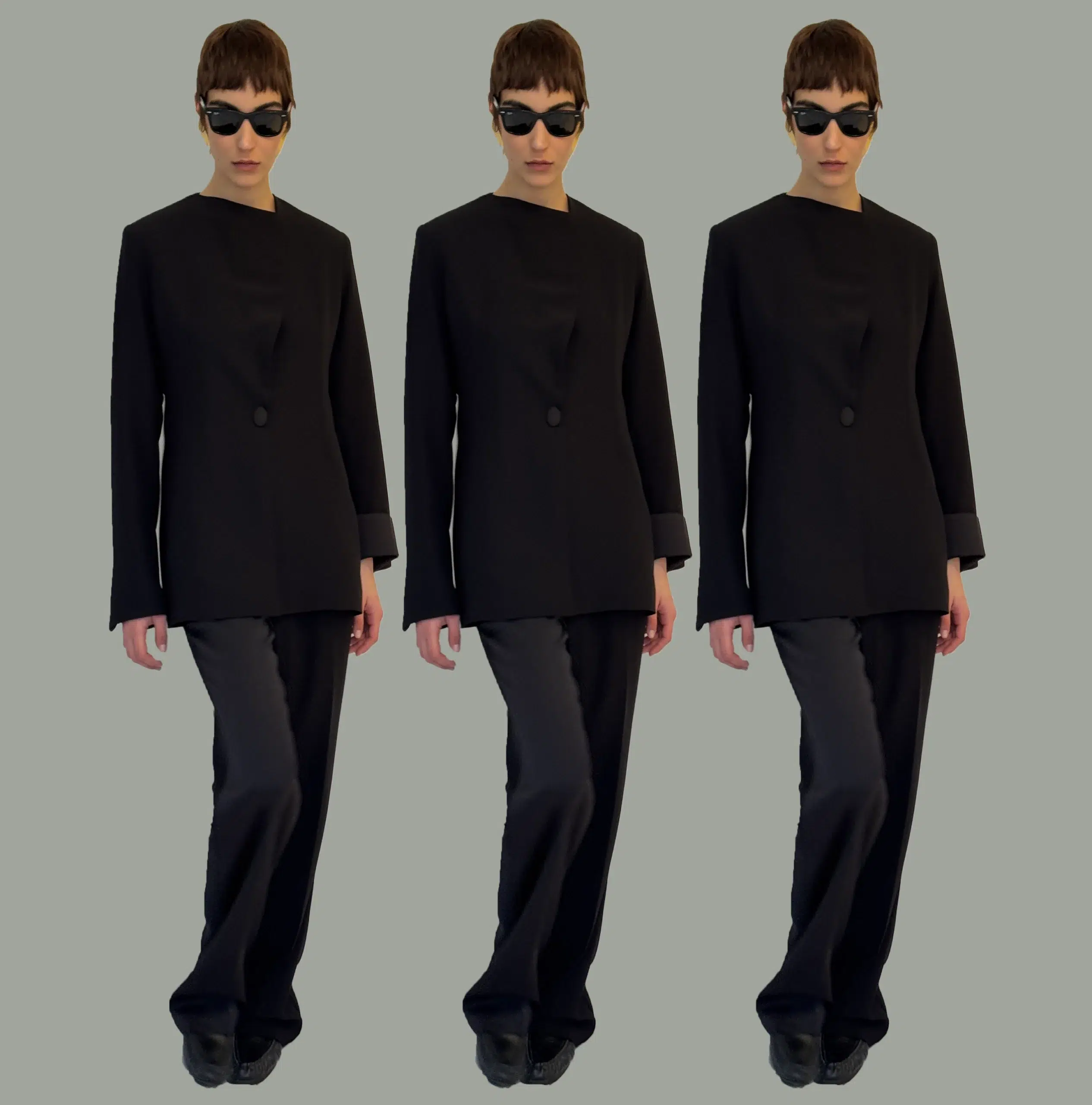 Structured shoulders with padding create definition and shape the waist, while the fit allows versatility depending on size choice, from more fitted to relaxed. A characteristic satin lapel can be worn open or closed, transforming into a mao style collar. The satin covered button adds a subtle statement, while the turn up cuffs reveal satin fabric details, offering a refined finish.