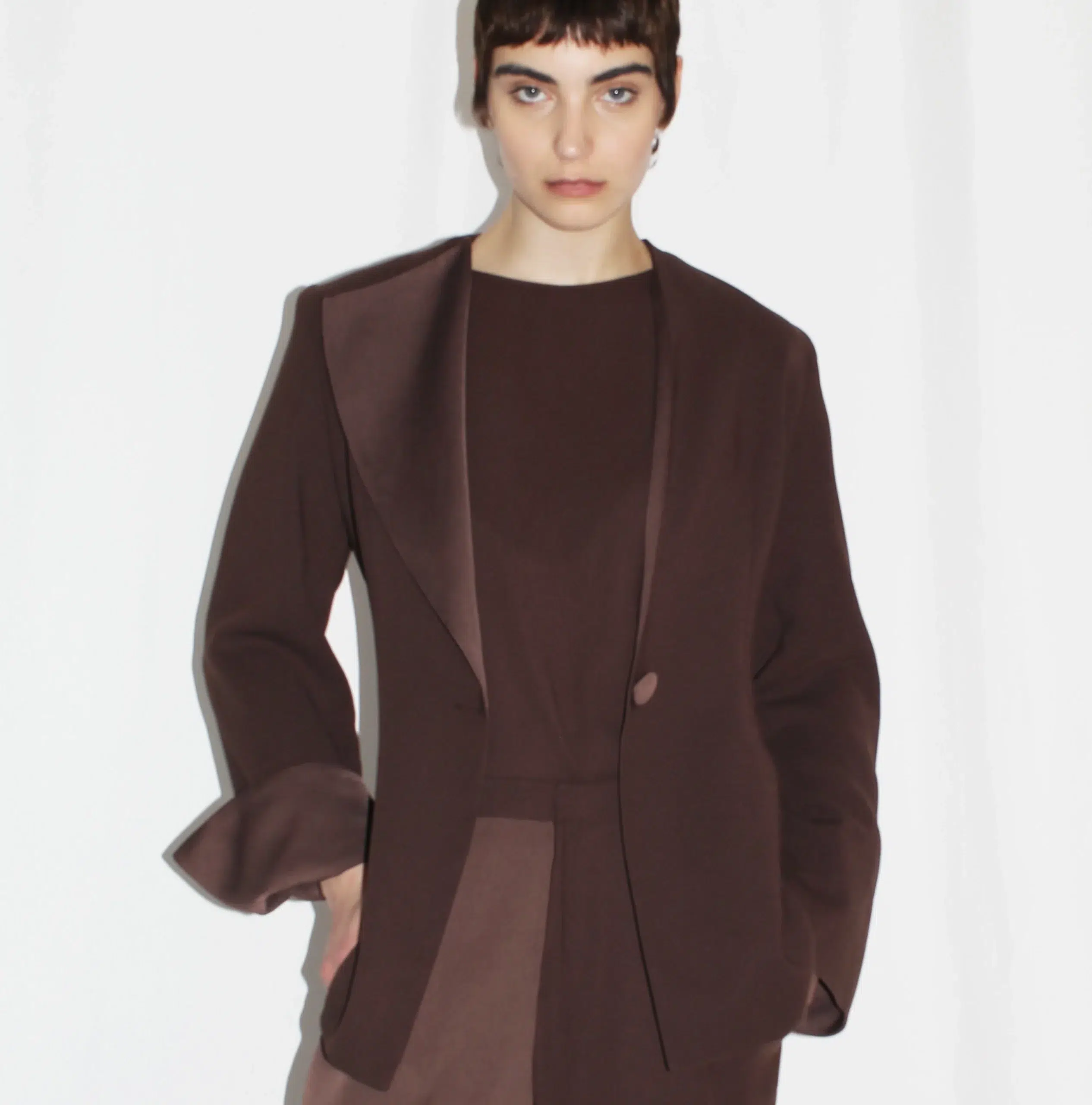 Structured shoulders with padding create definition and shape the waist, while the fit allows versatility depending on size choice, from more fitted to relaxed. A characteristic satin lapel can be worn open or closed, transforming into a mao style collar. The satin covered button adds a subtle statement, while the turn up cuffs reveal satin fabric details, offering a refined finish.